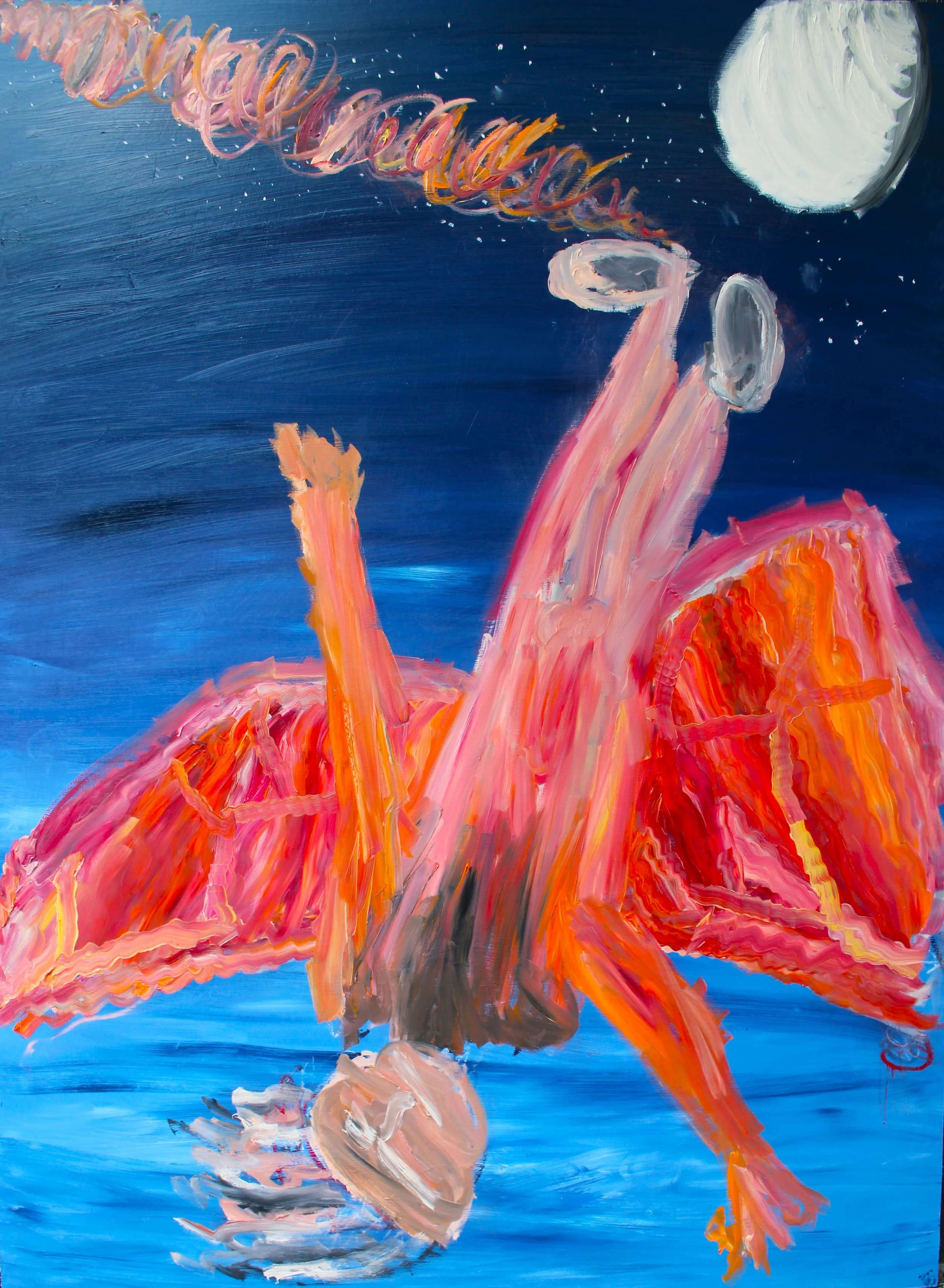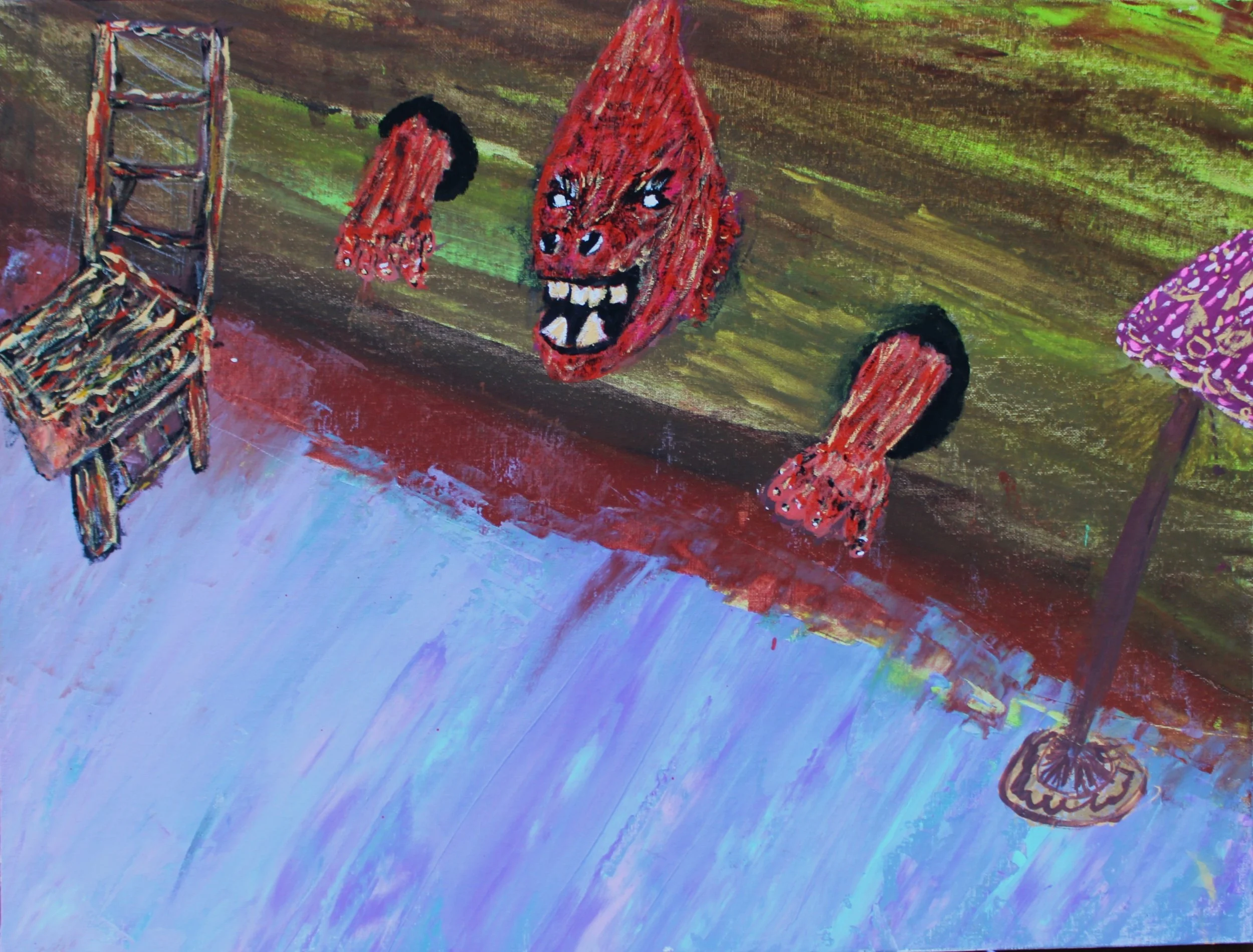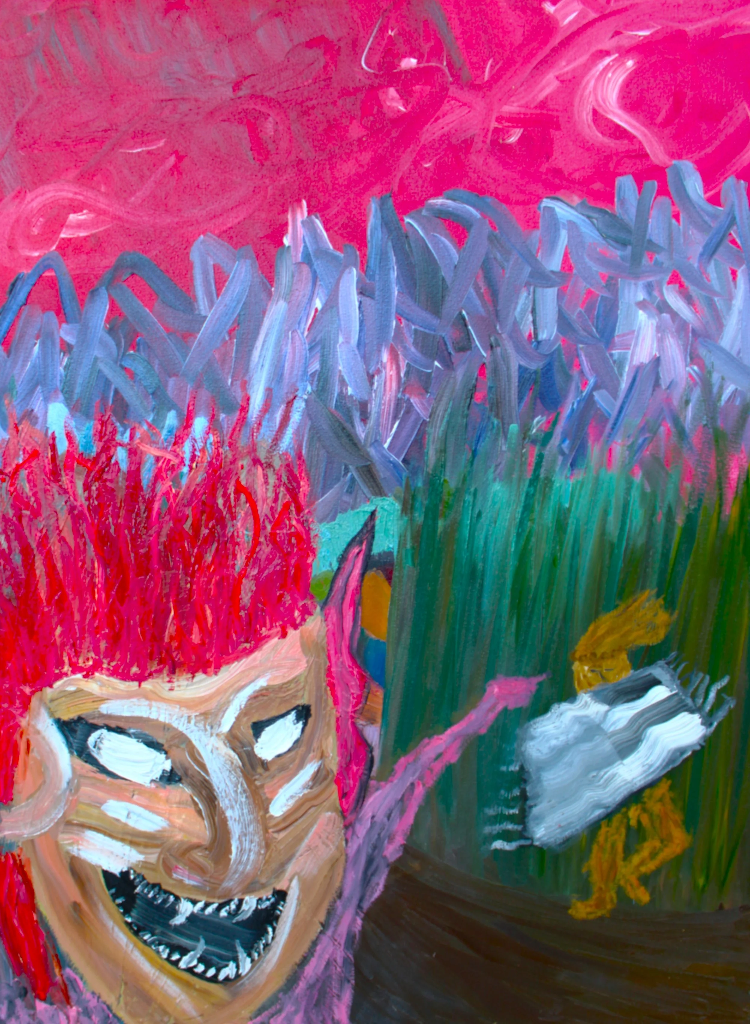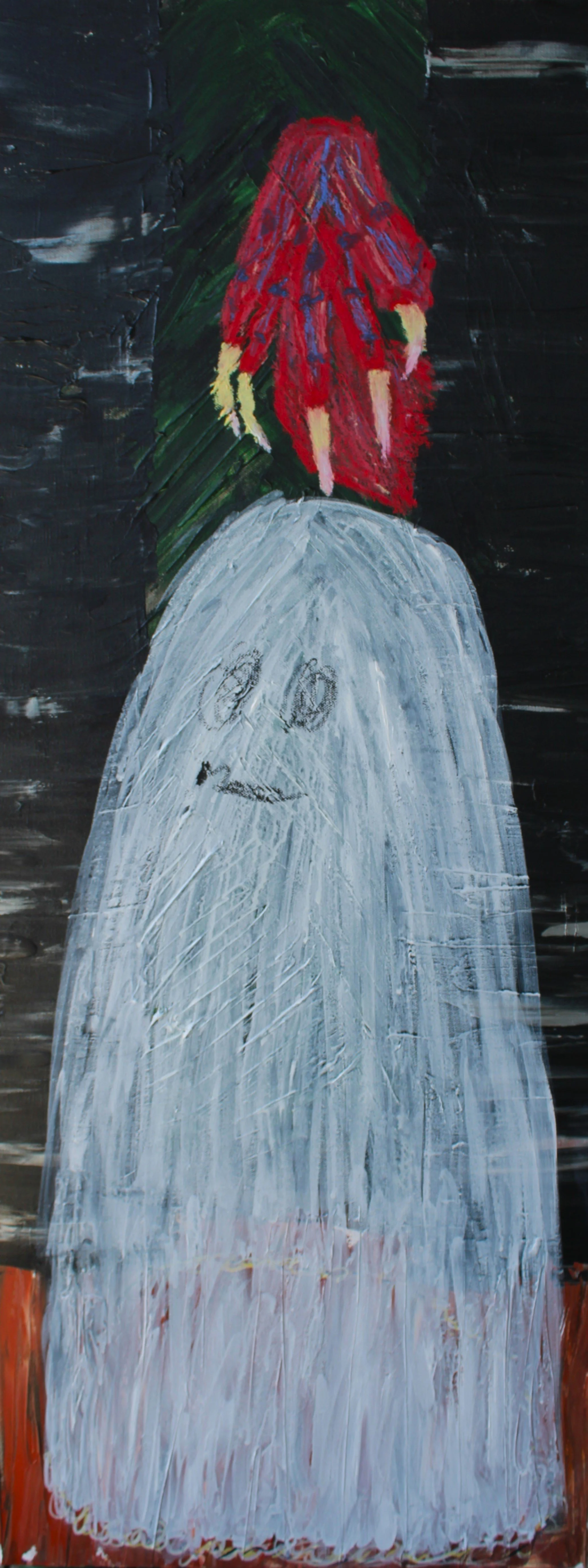 joyride (don't call her Elmo) 18x24 on laminated cardboard(?) acrylic, oil pastel