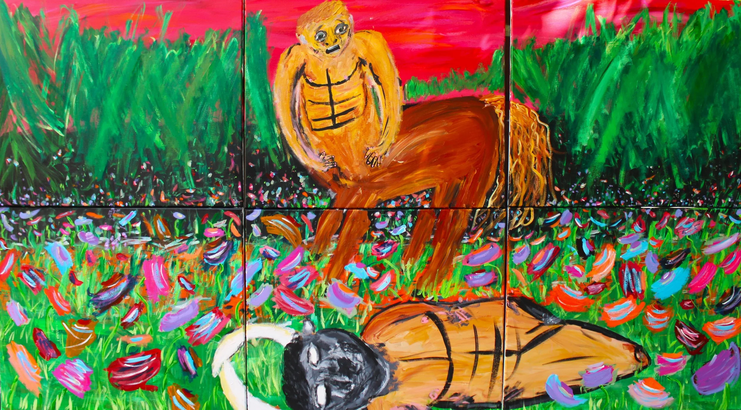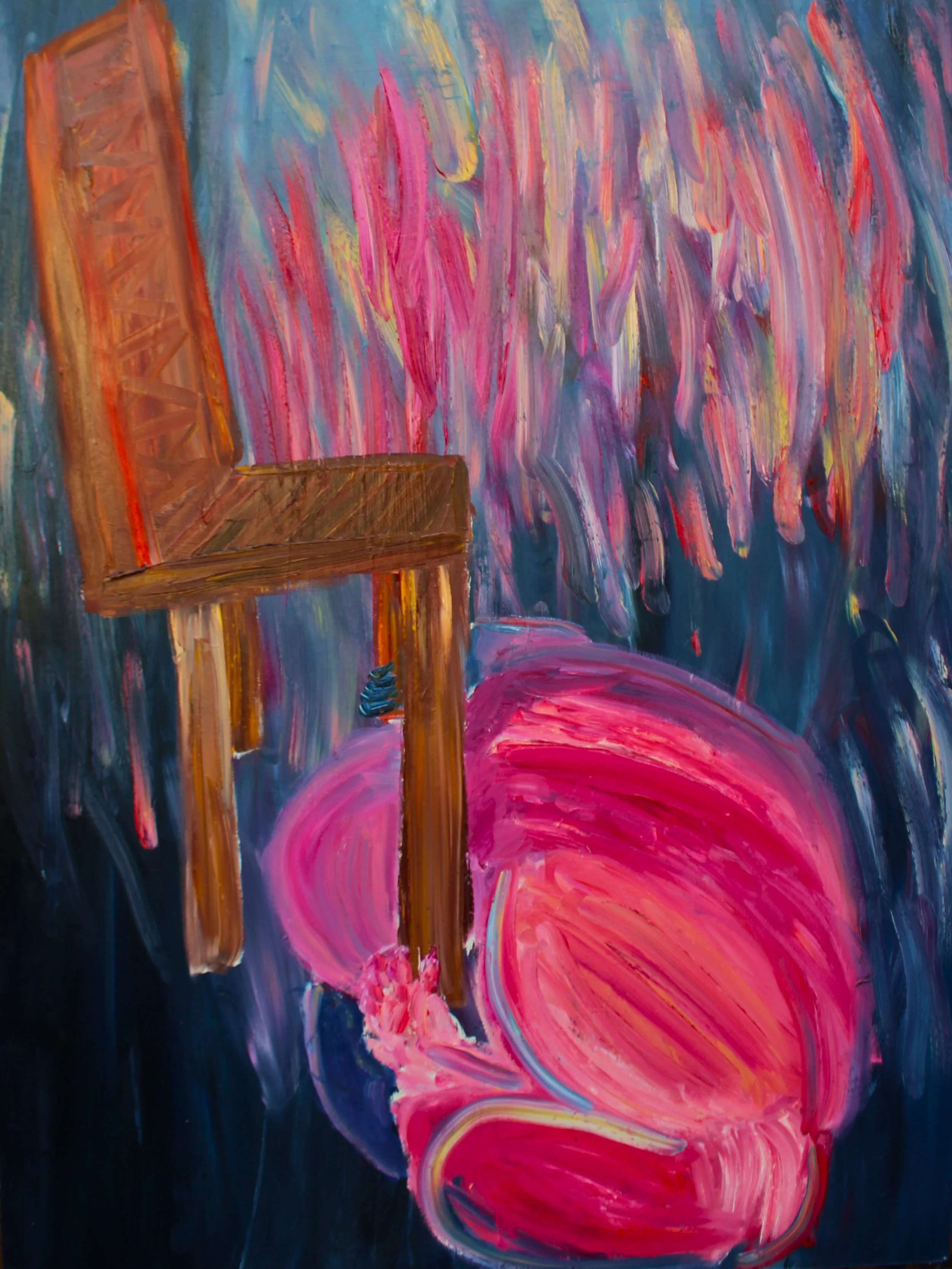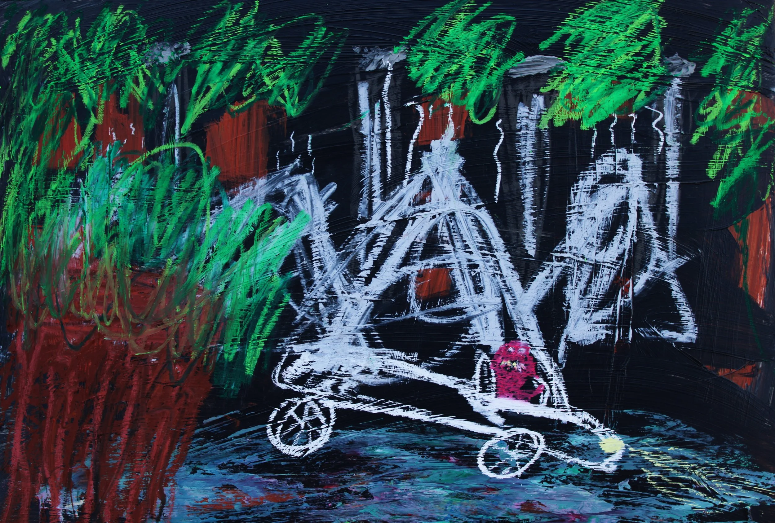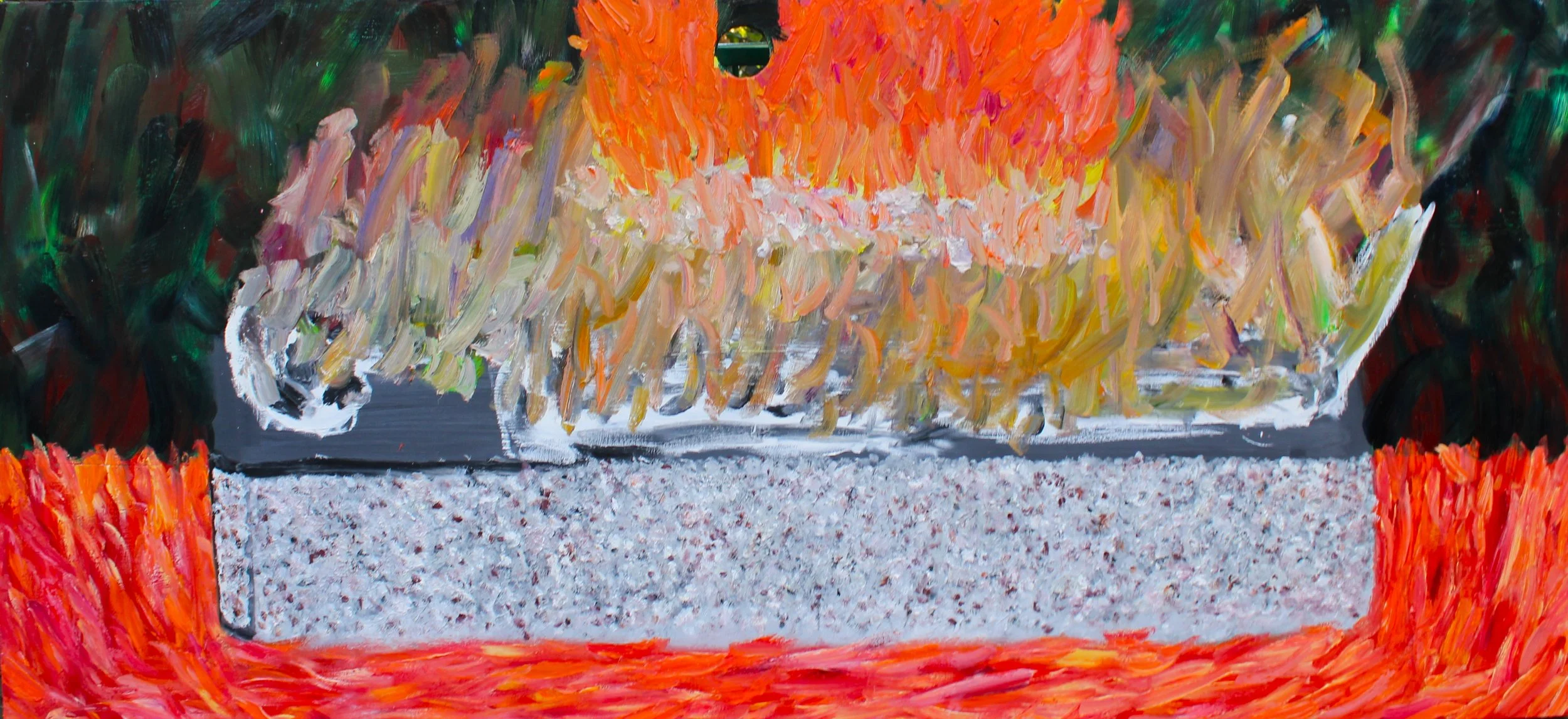 joyride (don't call her Elmo) 18x24 on laminated cardboard(?) acrylic, oil pastel